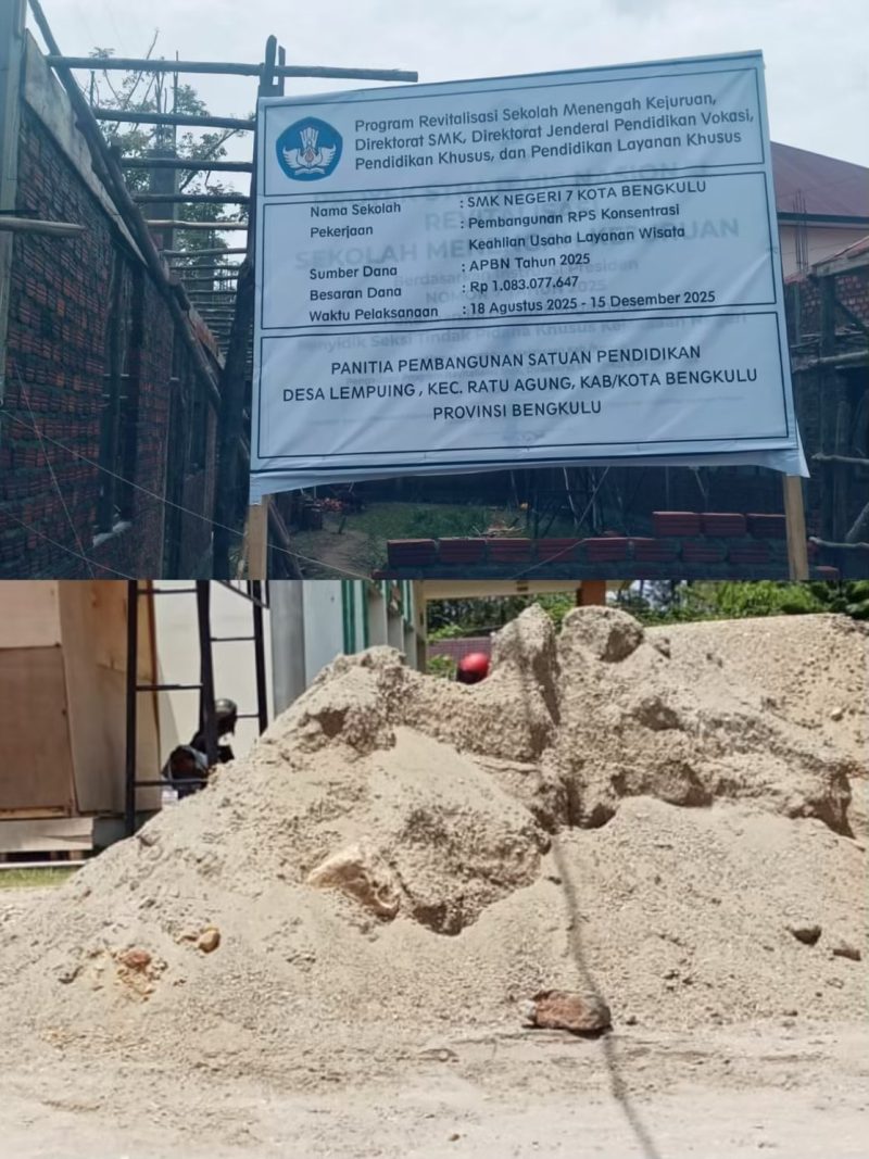 Bengkulu, swara-indonesia.com 22/10/2025– Proyek pembangunan gedung di SMKN 7 Kota Bengkulu yang bersumber dari dana APBN Tahun 2025 senilai Rp1.083.077.647 kini menuai sorotan publik. Pekerjaan yang dilaksanakan secara swakelola ini merupakan bagian dari program revitalisasi sekolah menengah kejuruan di bawah Direktorat Jenderal Pendidikan Vokasi Kementerian Pendidikan, namun justru diduga menggunakan material tidak sesuai standar.