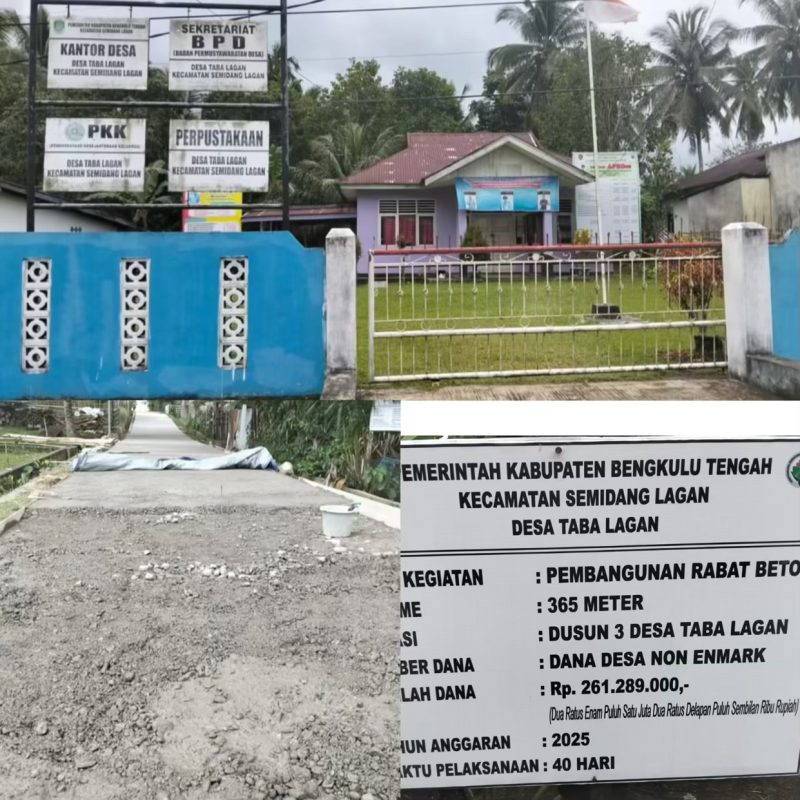 Bengkulu Tengah, swara-indonesia.com 24/09/2025 – Pelaksanaan pembangunan jalan rabat beton di Dusun 3, Desa Taba Lagan, Kecamatan Semidang Lagan, Kabupaten Bengkulu Tengah, kembali menuai tanda tanya besar. Proyek yang menelan anggaran Rp261.289.000 dari Dana Desa Tahun 2025 itu kini disorot lantaran sejumlah kejanggalan di lapangan.